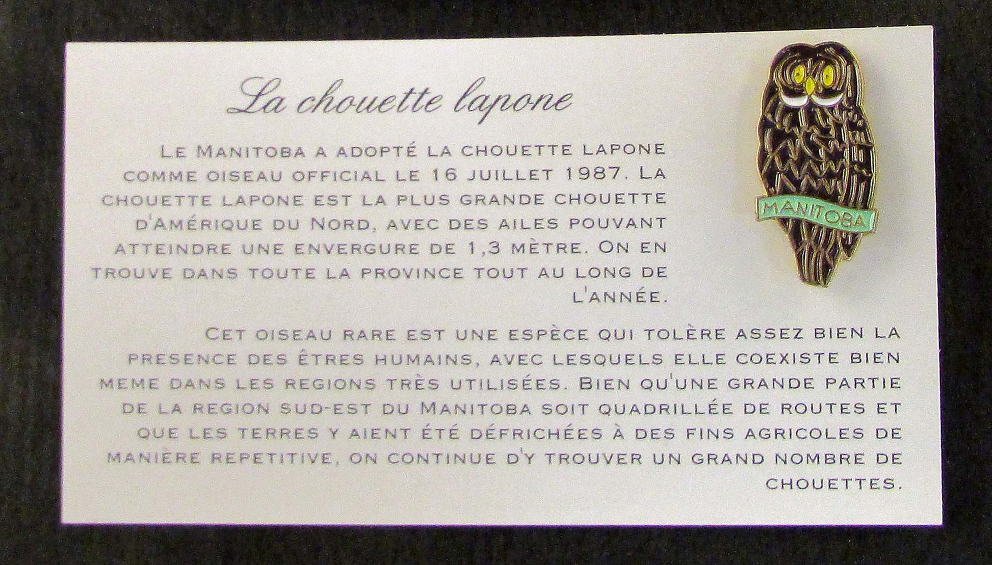 Manitoba''s official bird, the Great Grey Owl is perched on the word Manitoba.